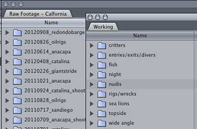 Once you start importing the footage into your editing software, make sure to name, tag, and organize clips in a way that works for you. Shots that don’t make it into the video you’re working on right now may turn out to be just what you need to fill in a gap in next year’s project, so make sure they’re all easy to find! I usually organize clips by trip as I go, and also keep a catalog of my favorite clips organized by subject (wrecks, kelp, nudibranchs, sea lions, etc.), which I may dip back into once I have “enough” footage of a subject to make a video.