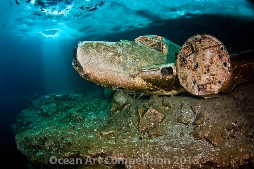 Under the ice, this local dive site at Morrison quarry, Wakefield, Quebec takes an all new perspective. I placed myself in a spot in order to capture the ray of light penetrating through the dive hole and I placed a strobe inside the plane to light the cockpit.