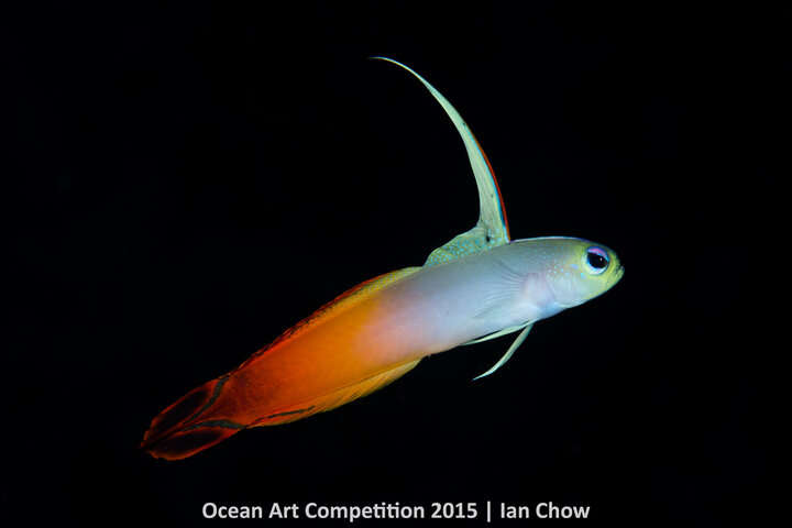 The story:  Fire Dartfish are beautiful but usually skittish.  With some luck, I met this little guy dancing in mid water just outside his burrow.  Aiming to get a black background without startling him, I pre-set my camera and strobes before I started to approach him slowly, staying low and controlling my breathing on the way.  We had eye-to-eye (camera) contact and he did not look all that happy.  I thought he would return to his hide but he didn’t.  After snapping a few shots, I let him continue his dance and waved goodbye.