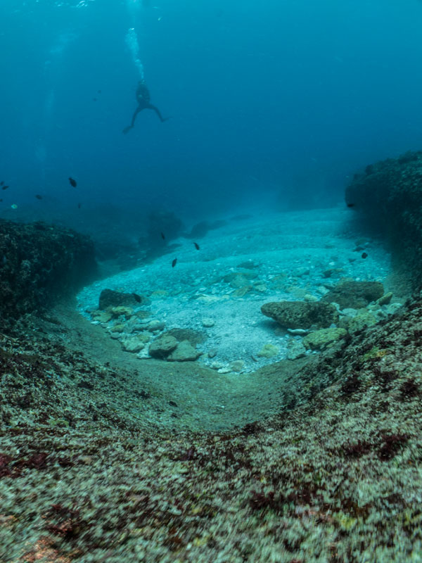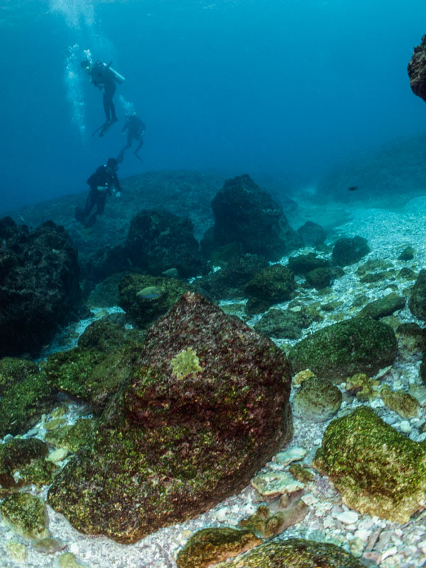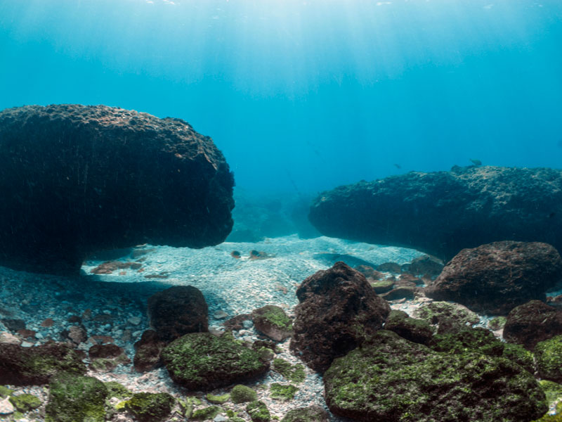 Not getting enough of Mantas, it was decided to dive the same spot again in the afternoon, hoping to get better photo opportunities. This time however the visibility in the bay was amazing, easily reaching 35 meters, so in our hearts we knew that spotting any Mantas was always going to be difficult. Pushing out of the bay in the hope of catching any more Mantas, the great water visibility brought to attention the dramatic landscapes around the bay. With a mixture of huge rocks and soft white sand, it was a refreshing experience to see the geographical effects of years of erosion on the seabed.