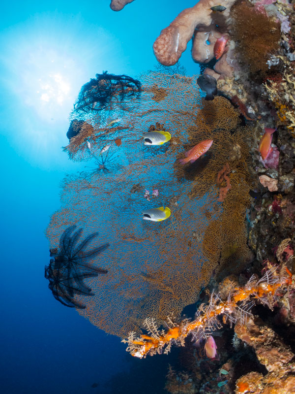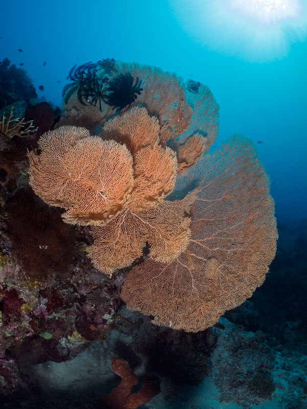 One of but many sea fan forms at Mengjangan. Taken with 2 Sea & Sea ys-110a at ISO80. Manual mode at f8 and 1/250s. Dyron 8mm fisheye