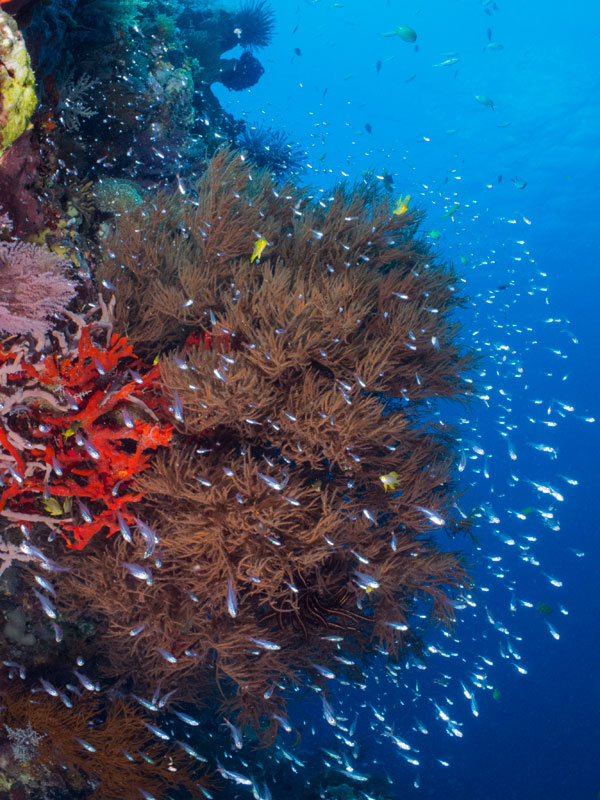 5 fish species on 1 seafan. Not bad. Taken with 2 Sea & Sea ys-110a at ISO80. Manual mode at f8 and 1/320s. Dyron 8mm fisheye