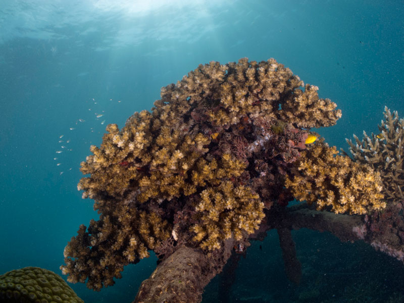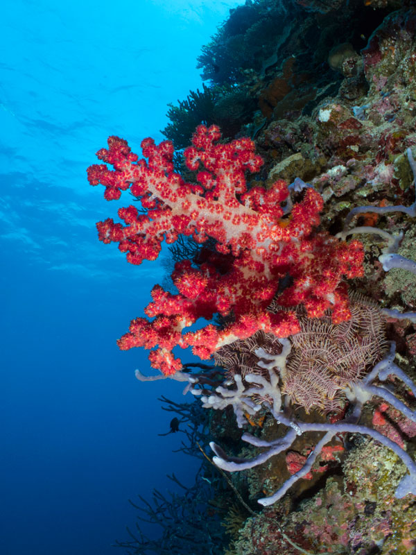 New coral sprouting on existing ones. Taken with 2 Sea & Sea ys-110a at ISO80. Manual mode at f8 and 1/320s. Dyron 8mm fisheye