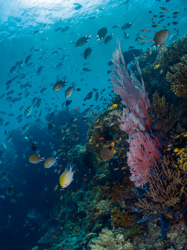 Plentiful and varied fish life. Taken with 2 Sea & Sea ys-110a at ISO80. Manual mode at f8 and 1/160s. Dyron 8mm fisheye