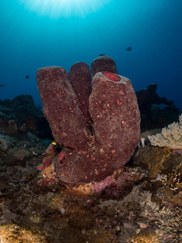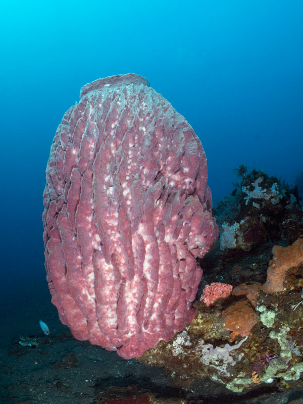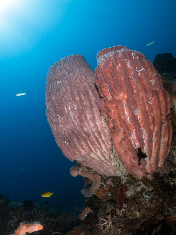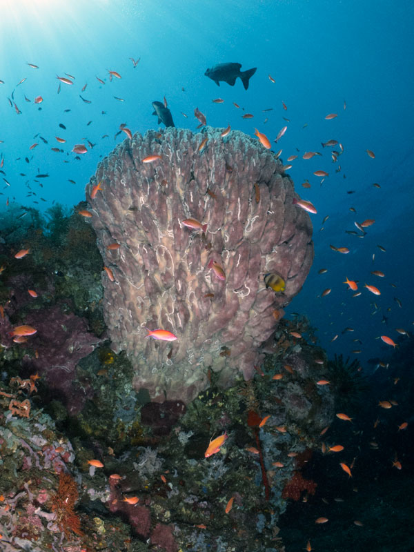 The site is accessed via the shore, and after descending down a gentle slope you come to the first in a series of drop offs, the bottom reaching a maximum depth of 30 meters where there are coral outcrops of various sizes. A singular feature in this underwater landscape is that at the tips of each drop off feature a huge barrel sponge of at least 1.5 meters high that juts out at barely possible positions and angles, much like watchtowers protecting a castle.