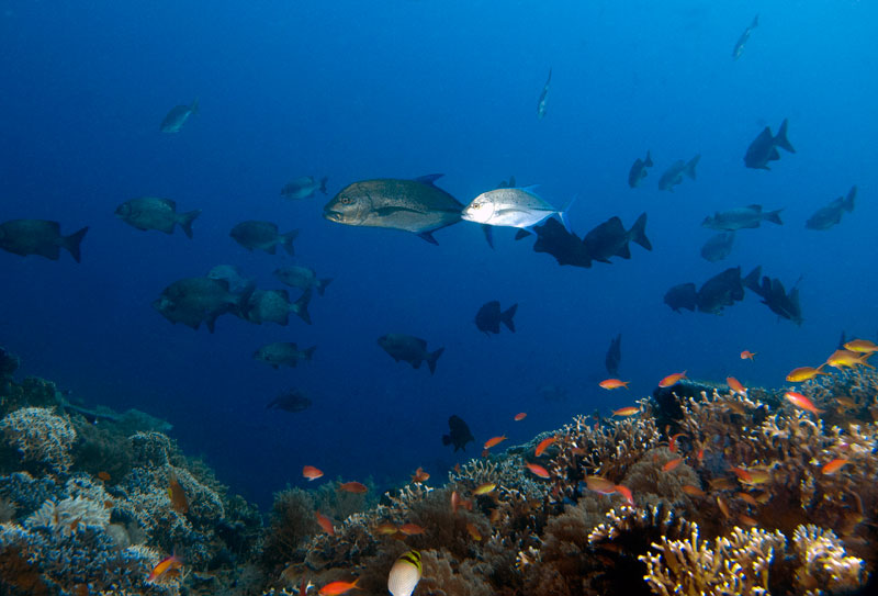 Trevally patrolling the reef. Taken with 2 Sea & Sea ys-110a at ISO80. Manual mode at f8 and 1/250s. Dyron 8mm fisheye