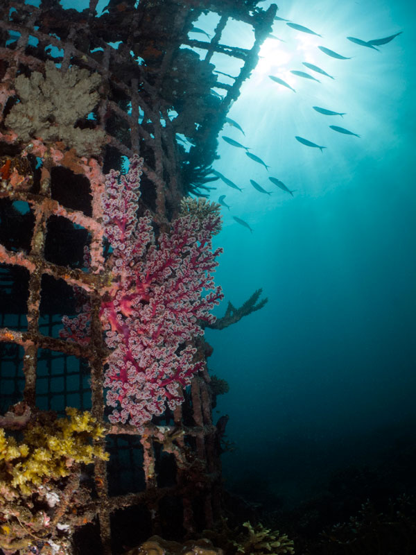 Biorock has been controversial from the outset, with critics arguing that using electricity to boost coral growth is counterproductive as the electricity used is generated from fossil fuels that contribute to changing climate patterns in the first place. There are now more than 40 metal frames installed in the shallow waters of Permutaran Bay, making it a significant enough spectacle for divers to visit the place. Thus for the villagers whether the project really helps to restore their reefs in the future is a moot point, for these underwater structures have been a boon to the development of the tourist trade in Permutaran.
