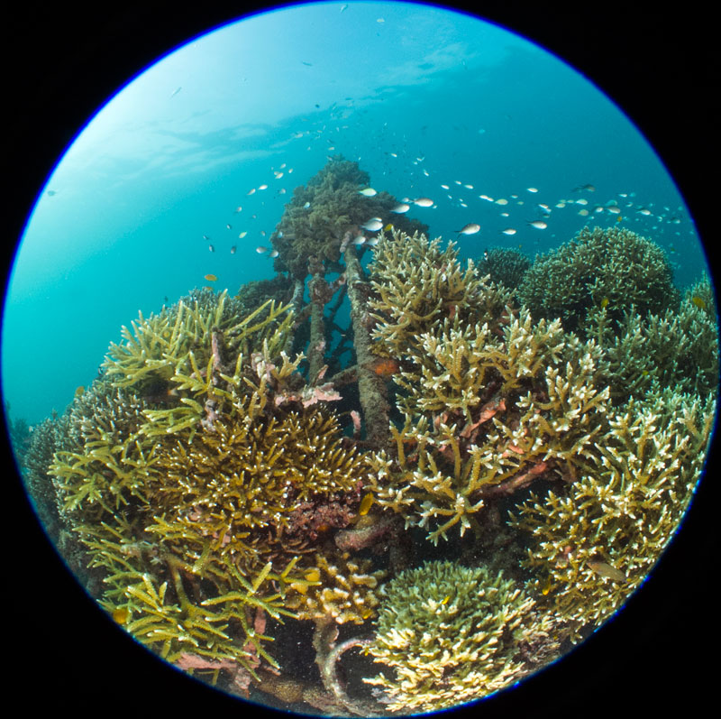 Damaged coral getting a new lease of life. Taken with 2 Sea & Sea ys-110a at ISO80. Manual mode at f8 and 1/800s. Dyron 8mm fisheye