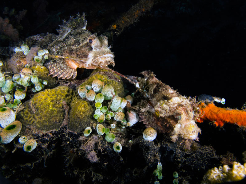 A pair of juvenile scorpion fish. Taken with 2 Sea & Sea ys-110a at ISO80. Manual mode at f8 and 1/100s.