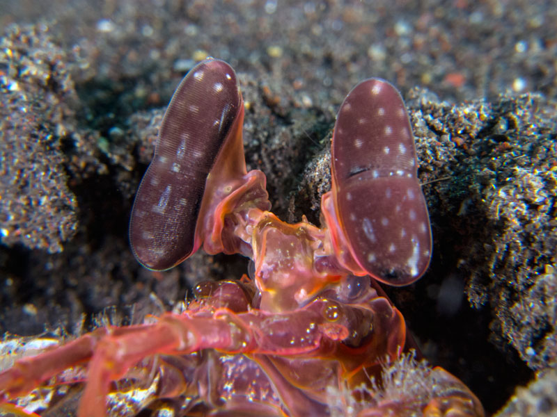 Lysioquillina Lisa Mantis Shrimp. Taken with 2 Sea & Sea ys-110a at ISO80. Manual mode at f8 and 1/250s. Dyron +7 diopter