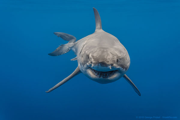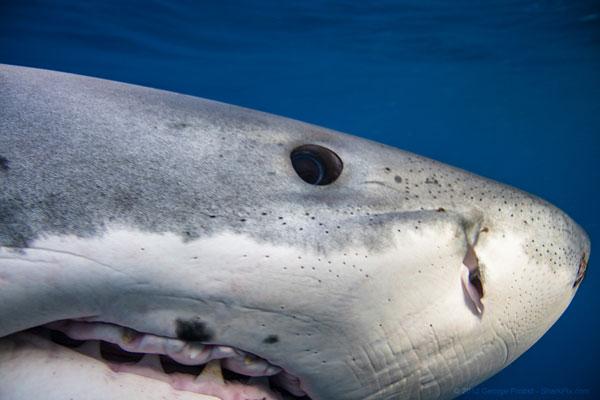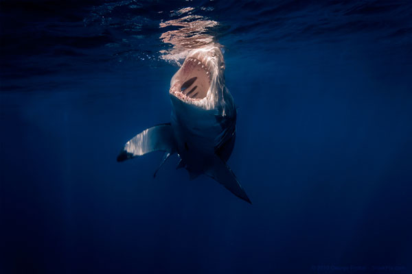 A white shark opens his jaws at the surface. While sharks are often depicted with their jaws open, these moments are generally the exception and not the norm.
