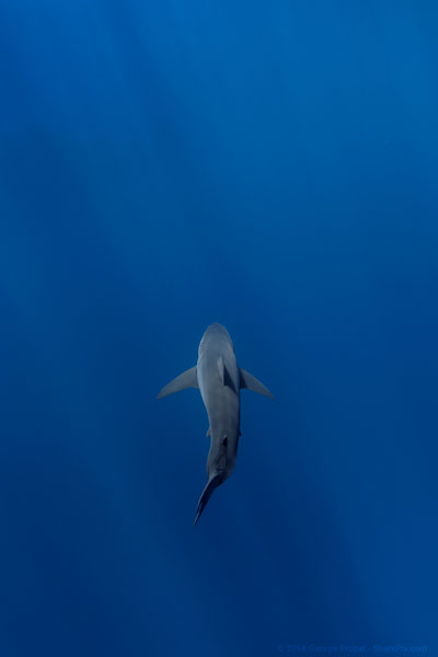 I tend to use spot metering and try to meter on the upper-grey part of the shark. I always shoot RAW, which makes dealing with white balance (among other things) a lot easier in post. At the surface, the light is generally quite good, allowing for low ISO settings. I’m not hard-core about having to shoot completely in manual mode when underwater, so I opt for aperture-priority mode. Depending on what direction a shark is coming from and its depth, exposure might vary tremendously. I dial in my aperture and leave the exposure up to the camera – this way I’m ready for sharks coming in from any direction.