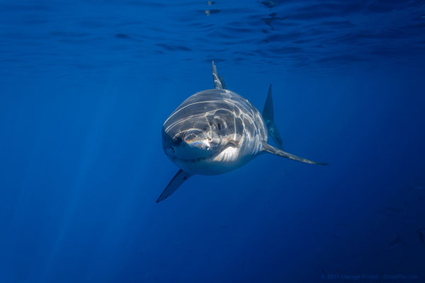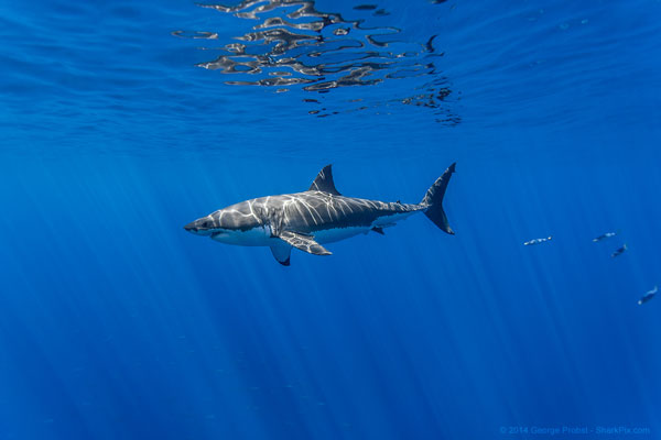 The position of the sun and the calmness of the surface can created a varied array of light patterns on the sharks. This male white shark is illuminated by an ever-changing pattern of light as he passes by just below the surface.