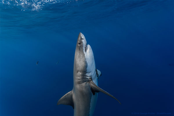 A male white shark swims gracefully through the blue depths below. The bottom drops to depths of 60-90m (200-300’) not far from shore at Guadalupe, creating a visibly bottomless view from above.