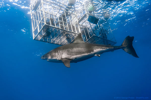 “Tzitzimitl,” a large female great white who is missing the upper portion of her caudal fin (tail), is another well-known shark who has visited the island for many years. This shot was taken from about 10m down and gives you a good look at the two surface cages above.