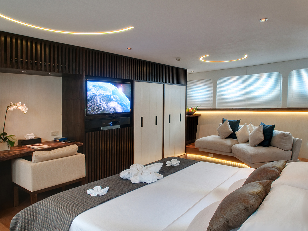 The Master suite spans the entire width of Pelagian’s beam and boasts a king bed, large flat screen television with Blu-ray DVD player, comfortable sofa and spacious bathroom with rainforest shower.