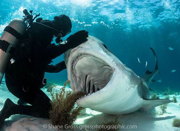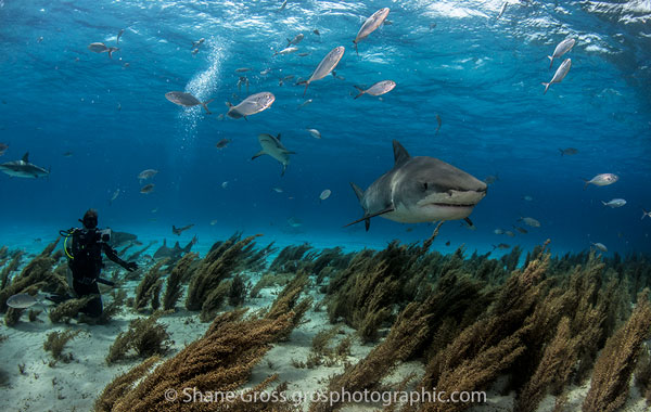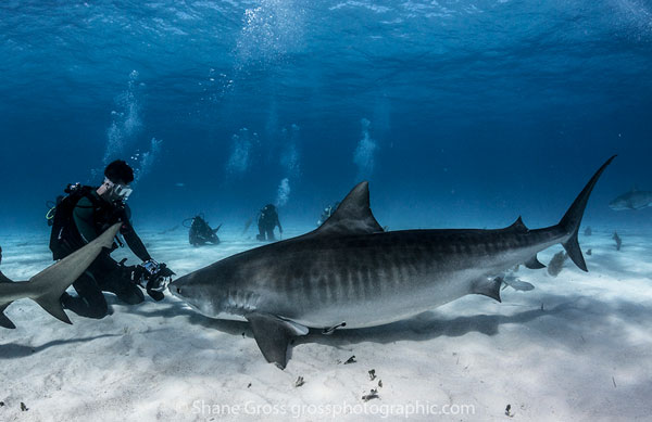 A photographer gets some close-up tiger shark action. Many of the sharks at Tiger Beach have overcome their shyness towards divers making close-up shots the norm.