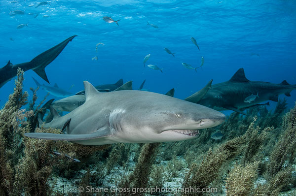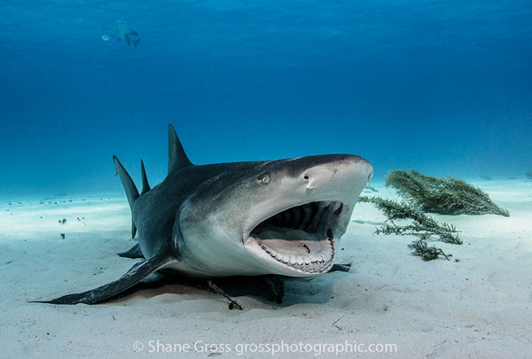 While tiger sharks are the main attraction they aren’t the only sharks in town. We also saw scores of lemon and Caribbean reef sharks. We had a couple of nurse sharks come in and I’ve seen many images of great hammerheads coming from this area. Even if the tiger sharks don’t show up (which is rare) I imagine it would still be a lot of fun diving Tiger Beach. One highlight for me was seeing the lemon sharks stop, lay on the bottom and open their mouths while small wrasse clean the sharks’ mouth and gills.