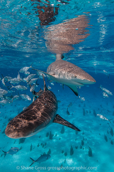 The typical background at tiger beach is a clean blue water and sand which can make for great black and white images. You can also choose to work with only natural light due to the shallow, clear water.