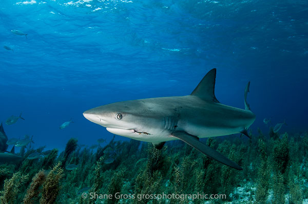 A Caribbean reef shark gliding by over the sea grass. When Tiger Beach was first established there were no Caribbean reefies. The site seems to get better with age!