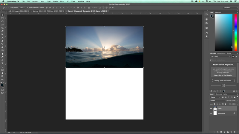 Export both of your images at the same pixel width from Adobe Lightroom. I chose 2500 pixels wide. Next, open both images in Adobe Photoshop. Select the split-shot as your main image, and simply extend the canvas to provide room below it for the whale shark photo. Do this by clicking IMAGE -> CANVAS SIZE and then setting the canvas to 3000 pixels in length.