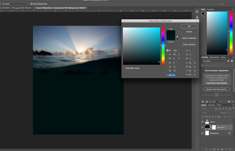 Obviously, this white canvas layer color will not suit our very organic-looking split-shot, so we add a new solid color layer and then sample the dark water color to replace the white. Do this by clicking the Create New Layer icon (half-shaded circle) in the bottom of the layers panel and choosing SOLID COLOR. Next, double-click the white square in the new Color Fill layer and the eyedropper tool will open. Just click the water under the split-shot and the white will be replaced by that color, as you see below.
