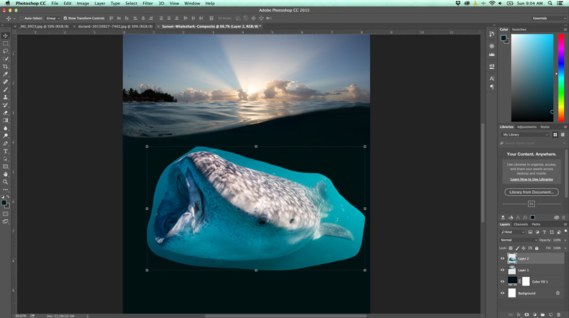 This is where we insert the whale shark. Like anything with Photoshop, there are many, many ways to remove this whale shark from the background and place it into our split-shot. Because the whale shark doesn’t have a clear border around it, I chose to lasso it and then paste it onto the split-shot with a rough blue border. To remove that border, we go back to the trusty eraser tool and slowly erase all of the whale shark background so that you can only see the whale shark’s body. I also used a lighter opacity to take away some of the detail around the tail, as it was just too obviously fake if I didn’t do that. (It still looks very fake, but hey, this is a fun experiment).