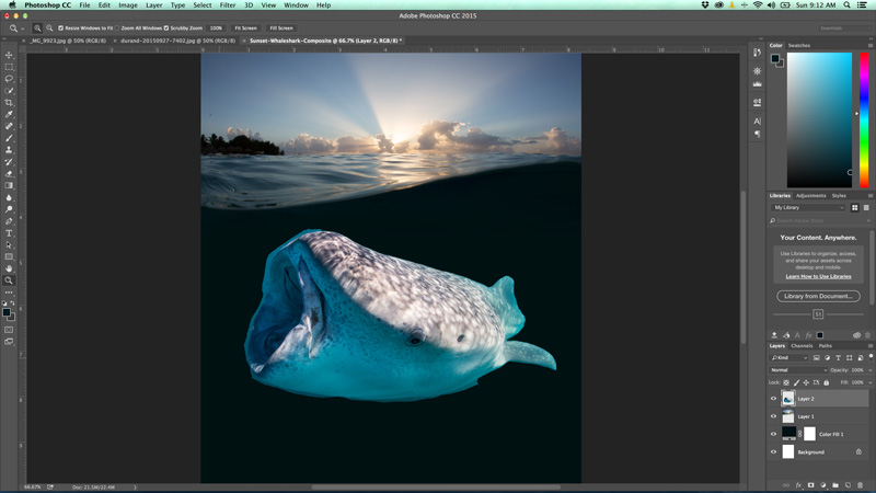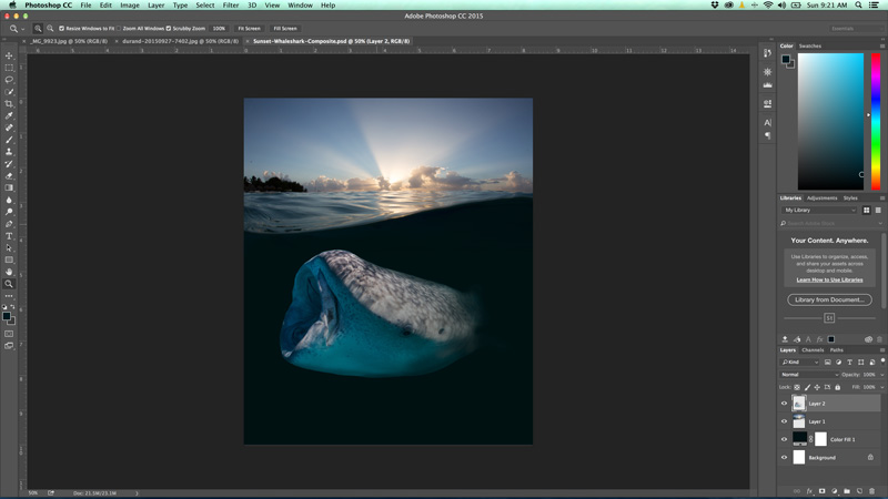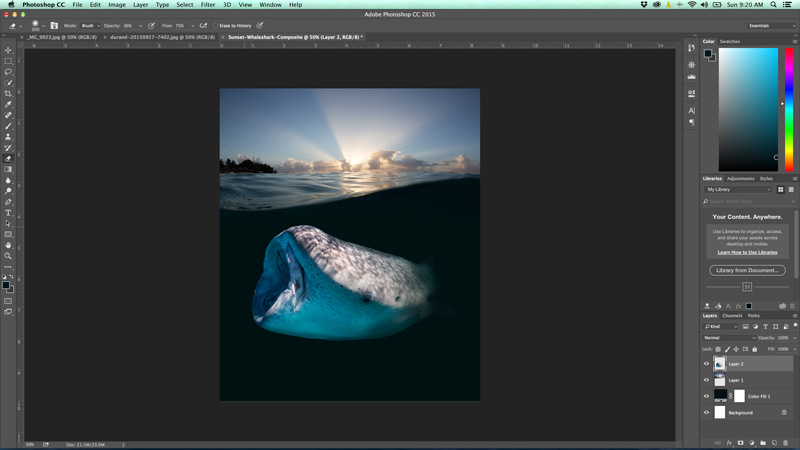I spent 21 minutes last Sunday combining the two photos below into one scene. The split-shot is pretty standard but has no interest below the surface. The color/lighting below the surface is pretty even, which makes adding the second image much easier. I have tons of whale shark photos just sitting in Lightroom, so I picked one that complemented the wave in the water of the split-shot, gives the image a chance to live outside of Lightroom.