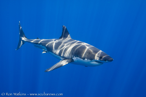 A great white shark shows off its impressive girth. Photo: Ron Watkins