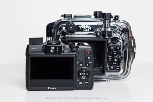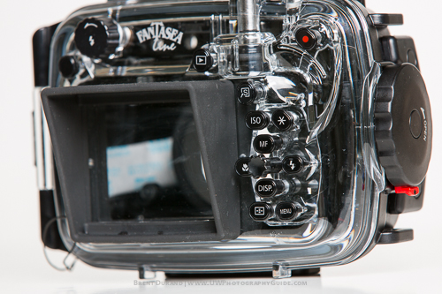 The FG16 housing looks stylish and functional right out of the box. The buttons/knobs are clearly labeled and placed in the same layout as on the G16 body. The front dial and exposure compensation dial each have a control knob on the housing. The zoom lever, camera mode dial (auto, manual, video, TV, AV, video, etc), and flash-up/down are easy to use. The video record button stands out for quick access when switching between photo & video modes.