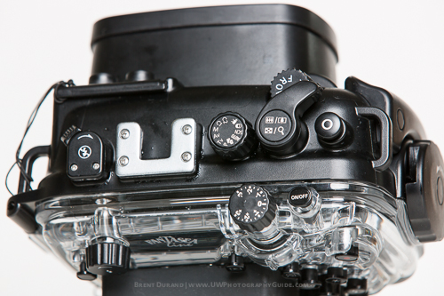 The top of the housing has a cold shoe mount for attaching a ball mount and focus light, GoPro or other accessory. The built-in moisture detector and alarm provides confidence in the system when underwater. Opening and closing the housing is easy.