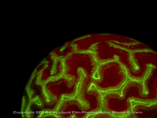 Fluorescing brain coral. F8, 1/60, ISO 400, 60mm.