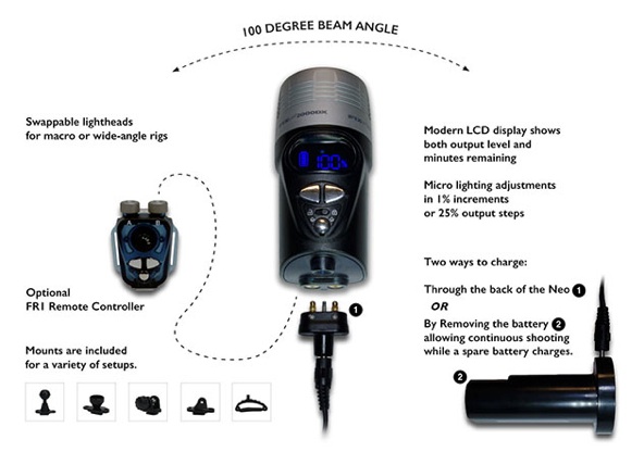 Pricing and AvailabilityNeo is available now in the the Americas and is distributed by Nauticam USA. The Neo 2000DX lumen wide model is available for $699 (US), Neo 1200DX lumen wide modes for $499 (US), 1200DX S lumen spot model for $499 (US), and the 800DX lumen for $349 (US). The FR1 is available as an optional accessory for $199 (US). Neo 2000DX and 1200DX models include, 1 battery, 100-240v charger, 1” ball mount, Loc-Line mount, YS-Mount, GoPro Mount, spare O-ring and charge plug cap. The Neo 800DX includes 1 battery, 100-240v charger, YS-Mount, spare O-ring and charge plug cap.