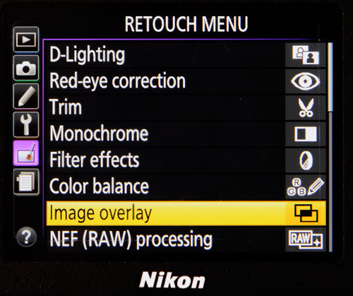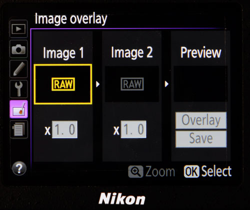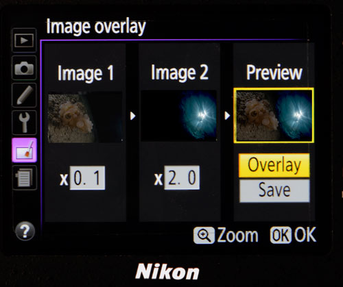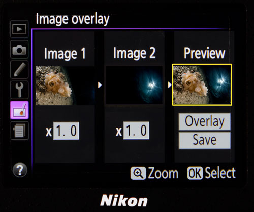 After we have our two images to overlay, we access the RETOUCH MENU and select the item IMAGE OVERLAY. At this point we find ourselves in front of the screen as shown in the images below.
