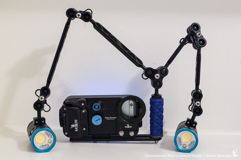 The Kraken Sports smart phone housing paired up with dual Kraken Hydra 5000 video lights, useful for both underwater video and constant lighting still images.
