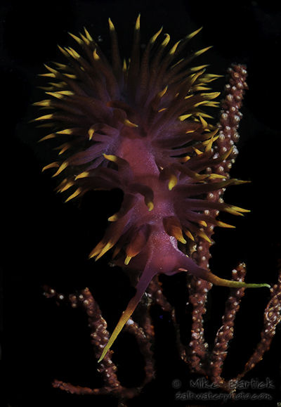 Hermosita sangria - Disturbed by my presence, this very beautiful Aeolid flared up and remained like this for quite some time. A quick turn of my camera from landscape to portrait helped to capture the long lines of both subjects and created a better composition.