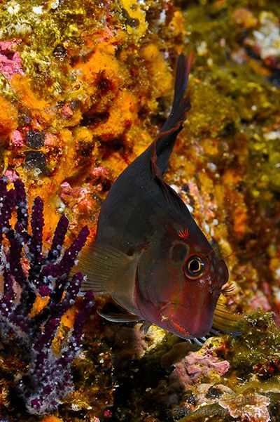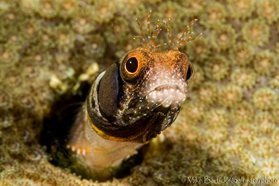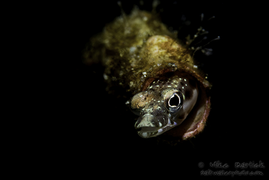 Brown spot and other barnacle blennies are easily found on the reef systems: pits in the encrusting hard corals and sponge make desirable hideouts for them. I find them quite photogenic as they peek out with their giant eyes moving about, reminding me of Skeletor. A 100 or 105mm lens with a diopter can really bring about some great macro images.