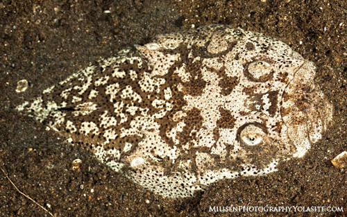 Our well-trained dive masters were able to find us every rarity we requested. It started to get a bit uncanny. I mentioned before a dive that ornate ghost pipefish (Solenostomus paradoxus) had always intrigued me. At the bottom of the mooring line on our way down we found a crinoid and sure enough, a tiny ghost pipefish poked its head out for the camera. We also found robust and halimeda ghost pipefish (Solenostomus cyanopterus and S. halimeda) on the same dive. Quickly we figured out that many of our bucket list items were pretty common here, so we started doing our homework and asking about animals that hadn’t been seen in a while. For example, the divemasters confided that they hadn’t seen a flamboyant cuttlefish (Metasepia pfefferi) in months. Sure enough, by the next dive, my buddy and I each had found our own cuttlefish to play with. Finally, on my last dive I recalled a strange fish called a stargazer (Uranoscopus sp.) that looks something like an Aztec face staring up from the sand. That night, well, I think you see where this story is going.