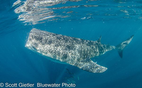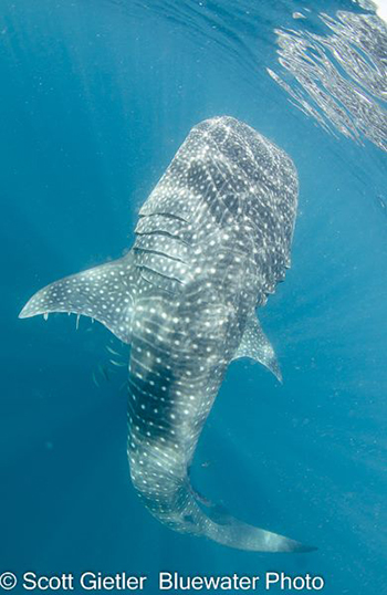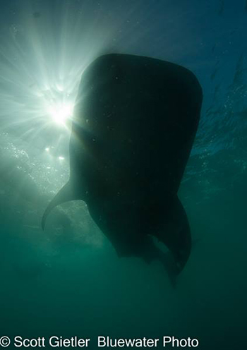 Shooting sideways and down onto whale sharks in ambient light creates beautiful photos, but so does shooting up at the whale sharks. Not only can you create beautiful silhouettes, but you can create nice sunbursts as well.