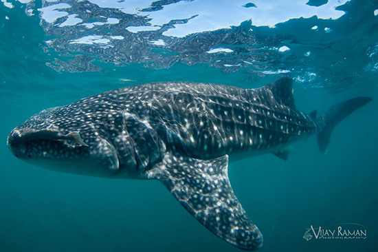 A fisheye lens on crop sensor DSLR allowed Vijay to get close to the whale shark without cutting off the tail of the big fish.
