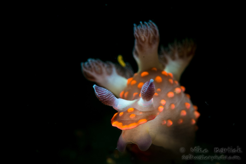 January brings cooler waters, which helps the corals and sponges to re-vitalize. Many of the oddball nudis show up to eat, meet and mate. Im using a snoot to isolate this Ceratosoma nudi from the rocks directly behind it.