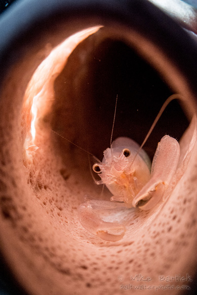 Snapping shrimp are easier to see on a night dive. They live in the base of vase sponges and will venture towards the opening after dark to feed on an opportune meal. Using an indirect light source, try back and side lighting the sponge as this will help you to get the shot, direct lighting is nearly impossible.