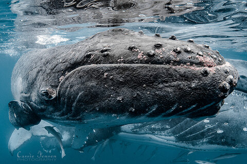 My two friends were still making their way over, and I felt alone with the whales and my mentor by my side. Time stopped for once in my life and I just floated weightless, inches from this enormous creature that was so new to this world, yet so trusting of all around it. I turned parallel to the calf, looking deep into its eye; questioning how such beauty exists in the world. As my two buddies joined us, I backed away to let them see the two without my presence. I looked beyond the calf’s tail, trying to figure out how much bigger the mother was. She was so massive, I could barely make out the end of her tail that seemed to stretch on forever. We remained by their sides in awe for about 15 minutes before we switched groups again. The hardest thing for me to do was to swim away from that beautiful moment. Fortunately, we had several drops with the mother and calf, and occasionally they would swim around us, going down a few meters before coming up for air again. Luckily, the pair trusted us to be around them for almost two hours before we made a group decision to let them continue resting without the presence of humans.