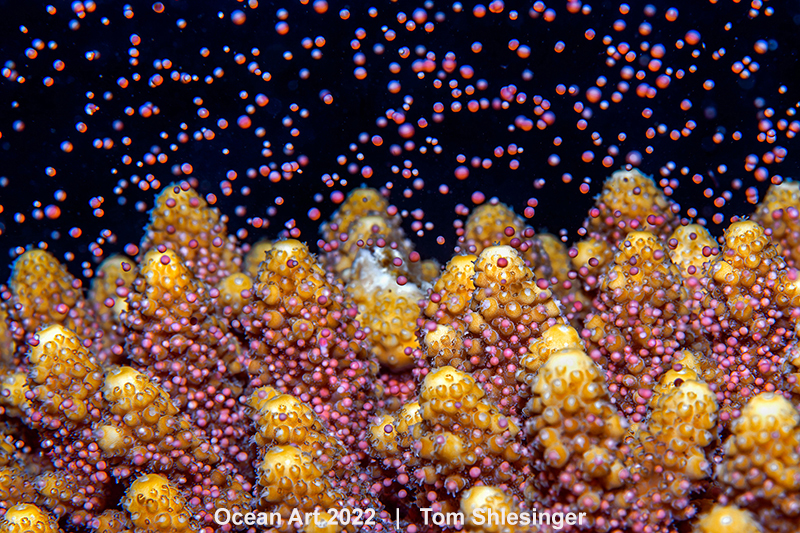 The Story: A branching coral spawns pinkish bundles of eggs and sperm. Corals are animals, and this is how they reproduce and create new generations of baby corals. Usually, at the exact same time, thousands of corals of a given species along hundreds of kilometers of the reef reproduce by spawning egg-and-sperm bundles altogether into the open sea. These bundles will be carried away by the currents, mixing in the water, until they finally encounter a match—a sperm will fertilize an egg and new life will be created. Yet catching coral spawning is tricky business as it usually happens only once a year in a certain month of the year, on a specific night of the month, and at a certain hour of the night for a very short time window of only a few minutes.