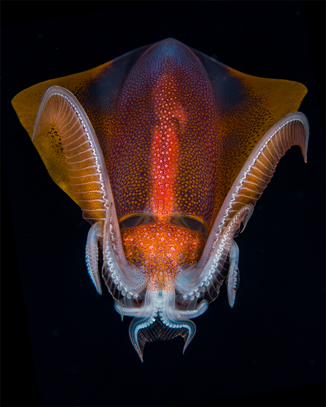 This large ~6 inch Diamond Squid (thysanoteuthis rhombus) was shot at night near the end of a typical Kona blackwater dive last February drifting about 6 miles offshore Kona, Hawaii over 6000 feet of water. It was first spotted by my dive buddy Sarah Milisen 65 feet down and started dropping fast into the black once discovered. By the time I intercepted it to take these shots it was at about 125 feet and paused momentarily to assume this “En garde” defensive posture before resuming its drop into the abyss.