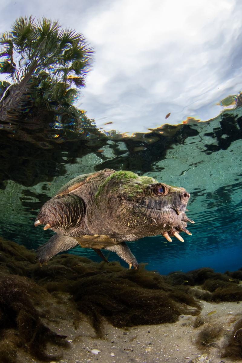"I captured this image while exploring a freshwater spring and river. Although I set out looking for manatees, my attention was captured by this common snapping turtle. I spent several hours observing her at a respectful distance and moving in to make images now and again. This individual is apparently blind and did not seem to mind my presence. She went about her business alternately resting, breathing, and foraging. Eventually, she came across a dead flatfish, commonly known as a hog-choker. The fish’s name comes from the tendency for its spines to get caught in pigs throats when scavenged. The spines, however, were no match for this turtle. She positioned the fish in her mouth and began to scrape away the spines with her forelimbs, as depicted here. Once satisfied she swallowed the remaining fish whole. Common snapping turtles play an important role, scavenging carrion from aquatic ecosystems in the South Eastern United States. The species is, however, omnivorous, and will consume vegetation and live prey too.