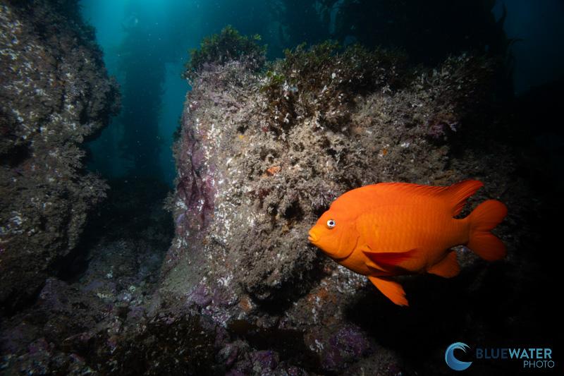 A fast moving garibaldi photographed in the kelp forest with the Sony A7CR and the new Light & Motion Sola X video light. f/7.1, 1/160, ISO200