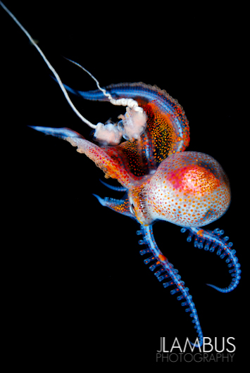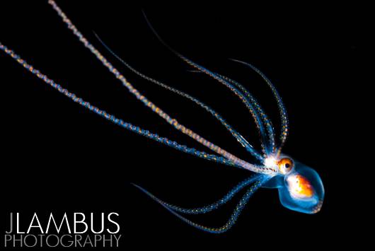 JL: Well the very nature of this dive is so different from others. Taking photographs during the dive is also about as different as it gets. The only way to practice for this dive is by doing this dive. Though I often say if you take a piece of aluminum foil and a piece of plastic wrap into your closet, turn out the lights and are able to photograph them together, in focus and both well exposed, you should be able to photograph blackwater. For the dive we head straight out a few miles, get over water that is thousands of feet deep, and jump in. It is a drift dive, in the open ocean, with tethers, at night. Keeping track of your buoyancy, while trying to stay righted in the current, and staying clear of tangling in the tethers, while trying to maintain your composure and fight off the vertigo, can be very difficult for some people. After doing this dive almost 400 times it still throws me for a loop from time to time. Not to mention the BIG animals we see out there. We've had Oceanics, Blues, Galapagos, Makos, Threshers and even big Marlin give us a spike in heart rate. Trying to track 3 Oceanic white-tips posturing at night with a focus light can be a bit disconcerting to say the least. Ok, so that's just the diving. The next thing to consider is…focus. Does your camera focus well in low light? If not are you good at manual focus? Which is better? Next is lighting. Best positions for strobes? How do you light up your subject without lighting up the rest of the plankton around it? Do you expose for the reflective part of your subject or the transparent part? How do you do both? How comfortable are you with knowing where the controls are on your camera? Because at night you can't see what you're doing, and you better have a good hold on that camera because if you drop it you don't get it back. Trust me.