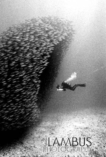 Charlie Getting Devoured. "This is only a very small part of the bait ball too… not only can you not see most of it in this photo, but another huge piece showed up and joined this one about 20 minutes into the dive. Back to my film addiction again. I love the grain and contrast. And how small the camera is! All of these bait ball photos were taken on film with a Nikonos V / 20mm sea&sea, while freediving (breath hold diving, no tanks). Depths up to 70ft."