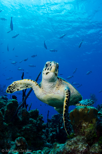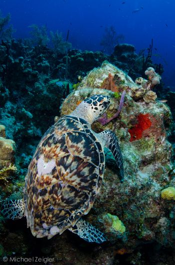 A young green turtle munching on some colorful sponges. It was so well camouflaged that I also swam right over it (I noticed a few divers in front of me that did just that). He needed his teeth cleaned with fluorine.
